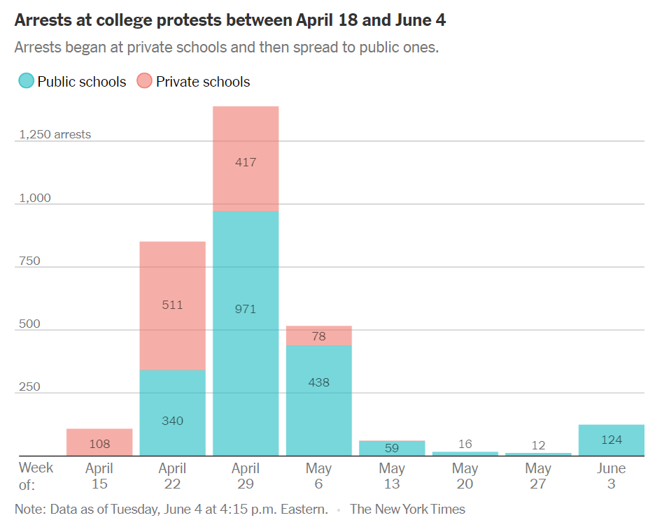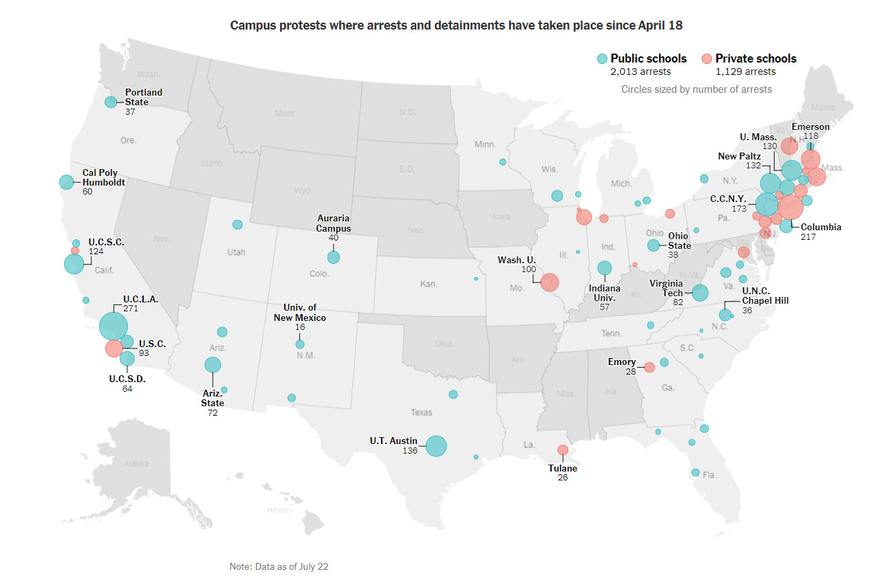 Σύμφωνα με στοιχεία που συνέλεξαν οι New York Times, φέτος συνελήφθησαν διαδηλωτές σε περισσότερα από 70 ιδρύματα σε τουλάχιστον 30 πολιτείες, από το Πολιτειακό Πανεπιστήμιο της Αριζόνα, με τους 80.000 φοιτητές του, μέχρι το Πανεπιστήμιο Μαίρη Ουάσινγκτον στη Βιρτζίνια, με ένα φοιτητικό σώμα κάτω από 4.000.