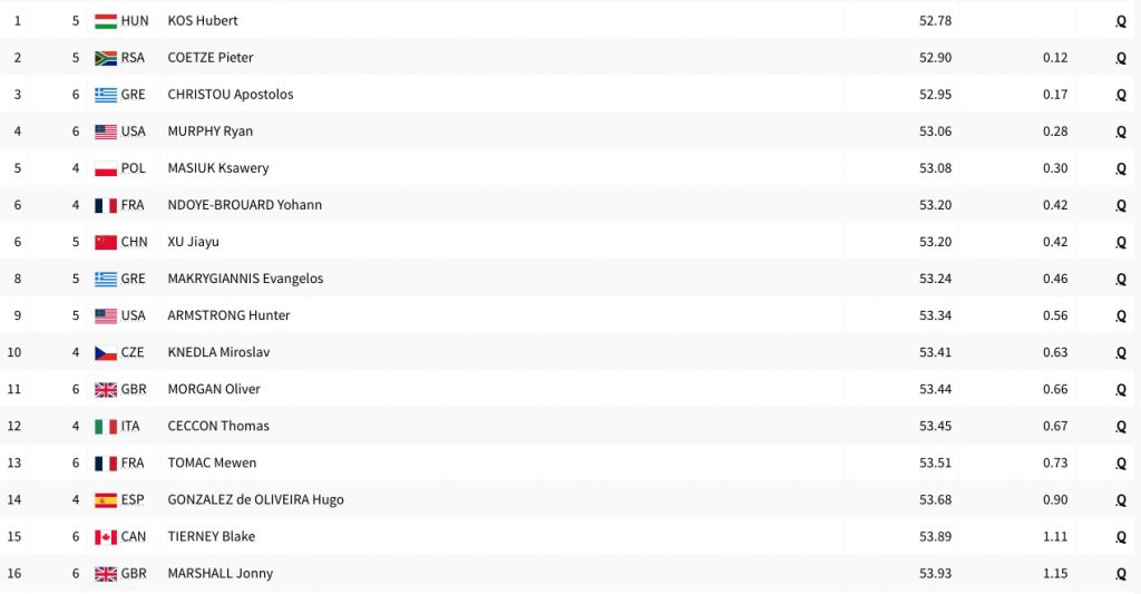 Ο Χρήστου έκανε την τρίτη καλύτερη επίδοση των προκριματικών με χρόνο 52.95 και ο Μακρυγιάννης την όγδοη με χρόνο 53.24.