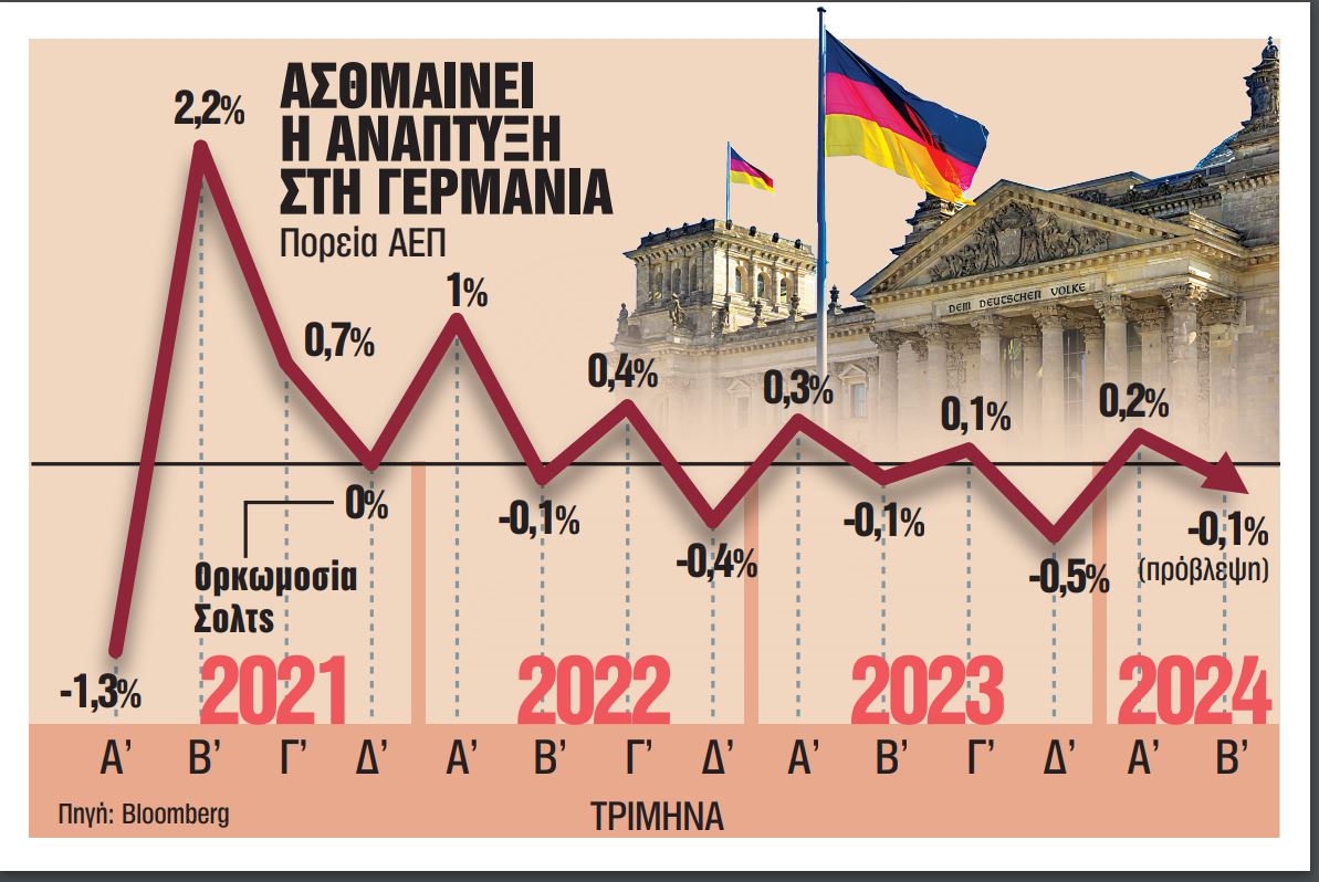 Οικονομικοί σύμβουλοι της κυβέρνησης στο Βερολίνο κάνουν προβλέψεις για ανάπτυξη φέτος που δεν θα ξεπερνά το 0,2%, ενώ πέρυσι η Γερμανία ήταν η μόνη χώρα της ομάδας του G7 που κατέγραψε συρρίκνωση στο ΑΕΠ. Η μείωση στην οικονομική δραστηριότητα το 2023 διαμορφώθηκε σε 0,2% σε σύγκριση με το 2022 σύμφωνα με τη στατιστική υπηρεσία της χώρας. Νέες μάλιστα εκτιμήσεις που είδαν το φως της δημοσιότητας μέσα στην εβδομάδα κάνουν λόγο για απροσδόκητη μείωση του ΑΕΠ κατά 0,1% το δεύτερο φετινό τρίμηνο αντί για αύξηση 0,1% σε σύγκριση με το πρώτο.