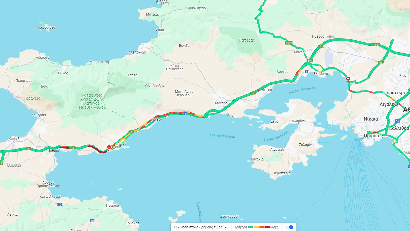 Για τον λόγο αυτό, γίνεται εκτροπή των οχημάτων προς Αθήνα μέσω της Παλαιάς Εθνικής Οδού στον κόμβο Αγίων Θεοδώρων. Και προς Αθήνα παρατηρείται ανάσχεση της κυκλοφορίας και τα αυτοκίνητα κινούνται με αργούς ρυθμούς.
