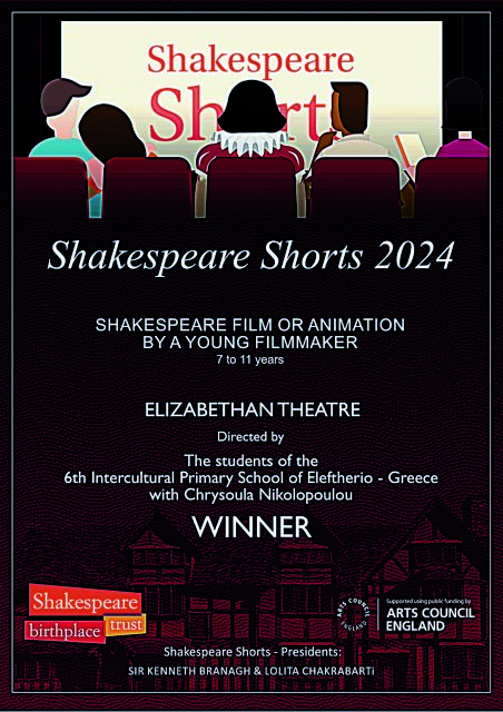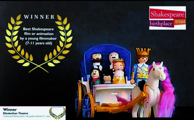 Το να σε βραβεύει το Shakespeare Birthplace Trust (ανεξάρτητο ίδρυμα κι ένας από τους φορείς που διαχειρίζονται την πολιτιστική κληρονομιά του Σαίξπηρ στη γενέτειρά του) για δουλειά σου σχετική με τον μεγάλο άγγλο συγγραφέα είναι, ούτως ή άλλως, σημαντικό. Πόσω μάλλον όταν είσαι μαθητής ή μαθήτρια της Πέμπτης Δημοτικού και το 10λεπτο ντοκιμαντέρ που δημιούργησες με τους συμμαθητές σου στη διάρκεια του μαθήματος βραβεύεται πριν από λίγες μέρες από το εν λόγω ίδρυμα ως «η καλύτερη ταινία ή κινούμενο σχέδιο με θέμα τον Σαίξπηρ από νεαρούς σκηνοθέτες ηλικίας 7-11» και χαρακτηρίζεται «πνευματώδης, δημιουργική, ενημερωτική και άριστα εκτελεσμένη». Αυτή η μεγάλη επιτυχία ανήκει στους μαθητές του 6ου Πειραματικού Διαπολιτισμικού Δημοτικού Σχολείου Ελευθερίου – Κορδελιού Θεσσαλονίκης και στη δασκάλα Αγγλικών Χρύσα Νικολοπούλου.