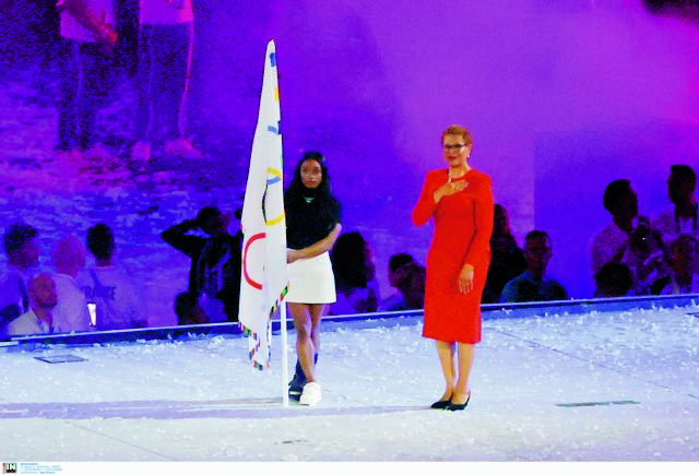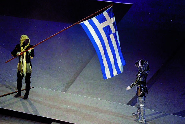 Η Νίκη της Σαμοθράκης με τον μασκοφόρο λαμπαδηδρόμο και τη Ζαν Ντ’ Αρκ αμαζόνα με την ελληνική σημαία