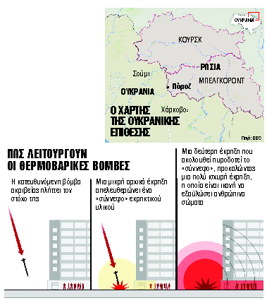 Το υπουργείο Αμυνας της Ρωσίας ανακοίνωσε ότι, στο πλαίσιο των συγκρούσεων στην περιοχή του Κουρσκ, έκανε για μία ακόμα φορά σε αυτόν τον πόλεμο χρήση του θερμοβαρικού όπλου που διαθέτει, γνωστού και ως «βόμβας κενού», που θεωρείται το πιο ισχυρό και φονικό όπλο πριν από τα πυρηνικά. Σημειώνεται πως ο συγκεκριμένος τύπος δεν είναι παράνομος, σύμφωνα με το διεθνές δίκαιο, υπό την προϋπόθεση πως δεν χρησιμοποιείται σε βάρος άμαχου πληθυσμού. Η χρήση του δε τη συγκεκριμένη στιγμή – όπως και ενός βορειοκορεατικού πυραύλου στη νέα επίθεση κατά του Κιέβου, σύμφωνα με τον ίδιο τον Ζελένσκι – αποτελεί αναμφίβολα μια προσπάθεια της Μόσχας να κάνει επίδειξη δύναμης και να ξεφύγει από τη δύσκολη θέση στην οποία έχει περιέλθει εξαιτίας της συνεχιζόμενης επίθεσης του ουκρανικού στρατού εντός του ρωσικού εδάφους, στο Κουρσκ.