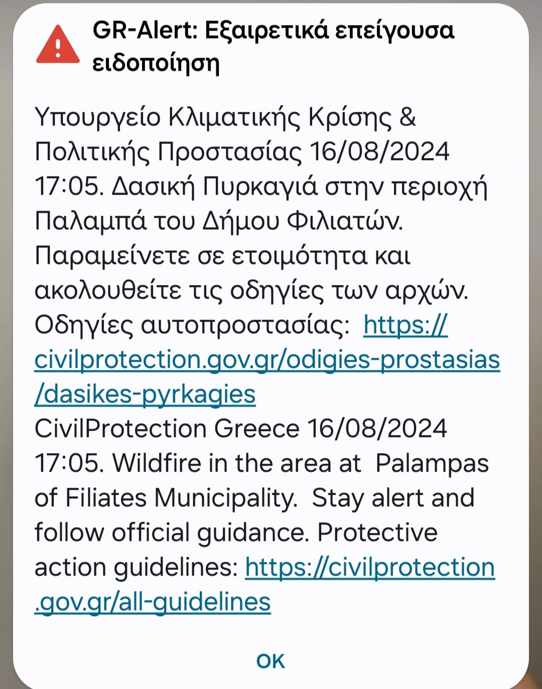 Λόγω της μεγάλη έκτασης που έχει λάβει το πύρινο μέτωπο ενεργοποιήθηκε το 112 καλώντας αρχικά τους κατοίκους να είναι σε ετοιμότητα ενώ με δεύτερο μήνυμα καλούνται να απομακρυνθούν προς Φιλιάτες.