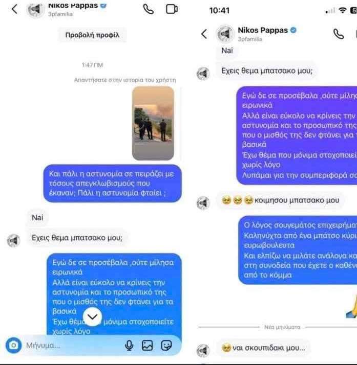 Ο Νίκος Παππάς απάντησε στις κατηγορίες που του προσάπτει η Νέα Δημοκρατία και η Ένωση Αξιωματικών Αττικής της ΕΛ.ΑΣ, με ένα story στον λογαριασμό του στο Instagram, κατηγορώντας την κυβέρνηση ότι επιχειρεί να αλλάξει ατζέντα μετά τις πυρκαγιές, ενώ τόνισε πως σέβεται τα σώματα ασφαλείας αλλά έχει το δικαίωμα να απαντά στο ύφος που αυτός επιλέγει σε «ακροδεξιά τρολ» όπως τα χαρακτήρισε.