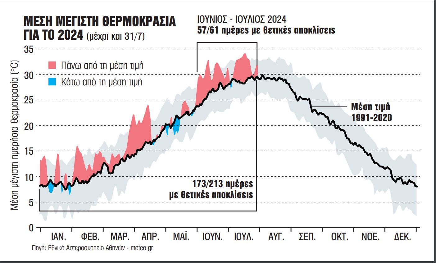 Με τις μέσες θερμοκρασίες στη χώρα μας τον Φεβρουάριο, τον Απρίλιο, τον Ιούνιο, τον Ιούλιο και, όπως φαίνεται, και τον Αύγουστο να είναι πολύ υψηλότερες από τη μέση τιμή της περιόδου 1991-2020, το θερμόμετρο τραβάει την ανηφόρα τη φετινή χρονιά. Η επιστημονική ομάδα του meteo.gr του Εθνικού Αστεροσκοπείου Αθηνών ανέλυσε μέρα με τη μέρα τις θερμοκρασίες που σημειώθηκαν στην Ελλάδα από την αρχή του 2024 και τα αποτελέσματα κάθε άλλο παρά αισιόδοξα είναι. Το ίδιο και το γεγονός ότι στην Αθήνα τον Ιούλιο είχαμε τον μεγαλύτερης διάρκειας καταγεγραμμένο καύσωνα. Και τα ρεκόρ συνεχίζονται με τις ενδείξεις του Copernicus για τις υψηλές ευρωπαϊκές θερμοκρασίες αλλά και την πρόσφατη ανακοίνωση επιστημόνων ισπανικού κέντρου θαλάσσιων ερευνών ότι τη 15η Αυγούστου καταγράφηκε η υψηλότερη γνωστή ημερήσια θερμοκρασία (28,90° C) στην επιφάνεια των νερών της Μεσογείου.