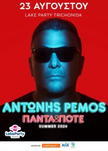 Την Παρασκευή 23 Αυγούστου, ο Αντώνης Ρέμος, δίνει ραντεβού με τους φίλους του, στο Lake Party, στη Λίμνη Τριχωνίδα! Μετά από αρκετά χρόνια, ο Αντώνης Ρέμος, μας έδωσε ένα ολοκαίνουργιο άλμπουμ με τραγούδια που έχουν ήδη ξεχωρίσει και αγαπηθεί, ένα νέο cd γεμάτο τραγούδια επιτυχίες που θα τον συντροφεύσουν το καλοκαίρι σε όλες του τις συναυλίες. Τραγούδια που με τη φωνή του και την αμεσότητα του, θα τραγουδήσουμε όλοι μαζί του.