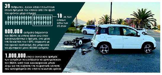 Κάθε χρόνο ο φόρος αίματος σε έναν δρόμο που εξυπηρετεί σχεδόν αποκλειστικά τη διασύνδεση Ανατολικής και Δυτικής Κρήτης είναι βαρύς. Σύμφωνα με στοιχεία του προέδρου του Συλλόγου Εθελοντών για την Πρόληψη των Τροχαίων Ατυχημάτων Γιάννη Λιονάκη, από την αρχή του χρόνου μέχρι σήμερα έχουν χάσει τη ζωή τους στους δρόμους του νησιού 39 άνθρωποι, 16 εκ των οποίων κάτω των 25 ετών, ενώ πέρυσι ο ίδιος τραγικός απολογισμός καταγράφηκε καθ’ όλη τη διάρκεια του έτους. Οπως αναφέρει χαρακτηριστικά ο ίδιος, από το 2015 μέχρι σήμερα οι νεκροί στον ΒΟΑΚ ξεπερνούν τους 110. Ο Γιάννης Λιονάκης, που «είναι αναγκασμένος να τον χρησιμοποιεί», δηλώνει ότι κάθε φορά που εισέρχεται σε αυτόν νιώθει φόβο και βρίσκεται σε εγρήγορση λόγω των σχεδόν καθημερινών τροχαίων συμβάντων, εκφράζοντας την ανησυχία ότι το 2024 θα αποτελέσει την πιο αιματηρή χρονιά της δεκαετίας.