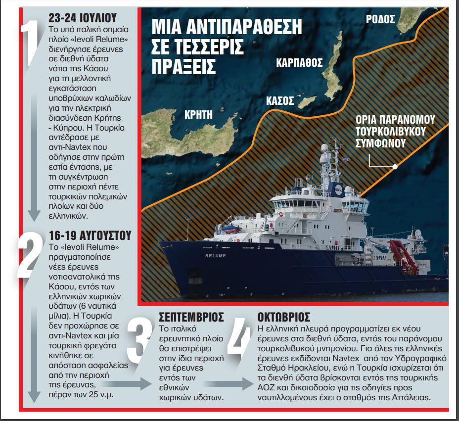 Χαρακτηριστική του τρόπου που αντιδρά η Τουρκία στις εν λόγω έρευνες, αναλόγως του αν αυτές διεξάγονται σε διεθνή ύδατα ή όχι, ήταν η πρόσφατη, δεύτερη φάση ερευνών του ιταλικού σκάφους, η οποία έλαβε χώρα σε ελληνικά χωρικά ύδατα στις 19 Αυγούστου, καλύπτοντας απόσταση 10-12 ναυτικών μιλίων, με κίνηση από τη νοτιοδυτική πλευρά της Κάσου προς τη νοτιοανατολική. Εκεί – σε αντίθεση με την προ μηνός περίσταση έντασης και αγωνίας που διαμόρφωσαν η παρουσία και οι αντιδράσεις της Αγκυρας – έπλευσε μόνο μία τουρκική φρεγάτα και σε μεγάλη απόσταση από το σημείο των ερευνών όπου επιχειρούσε το ιταλικό πλοίο συνοδεία ελληνικής κανονιοφόρου και ελληνικής φρεγάτας. Συγκεκριμένα, όπως έγινε γνωστό, το σκάφος του τουρκικού πολεμικού ναυτικού έπλευσε αποκλειστικά σε ύδατα διεθνή και σε απόσταση 25 ναυτικών μιλίων από το «levoli Relume».