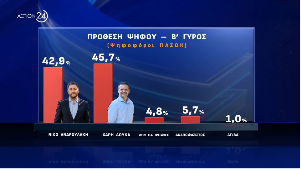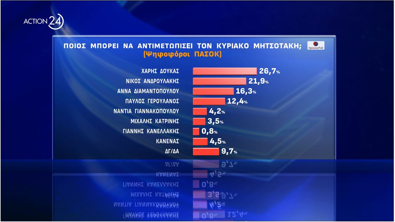 Στην δημοφιλία των υποψήφιων αρχηγών, εξακολουθεί να προηγείται ο Νίκος Ανδρουλάκης και ακολουθούν οι Παύλος Γερουλάνος και Χάρης Δούκας.