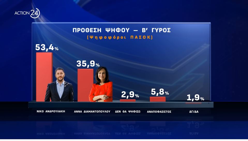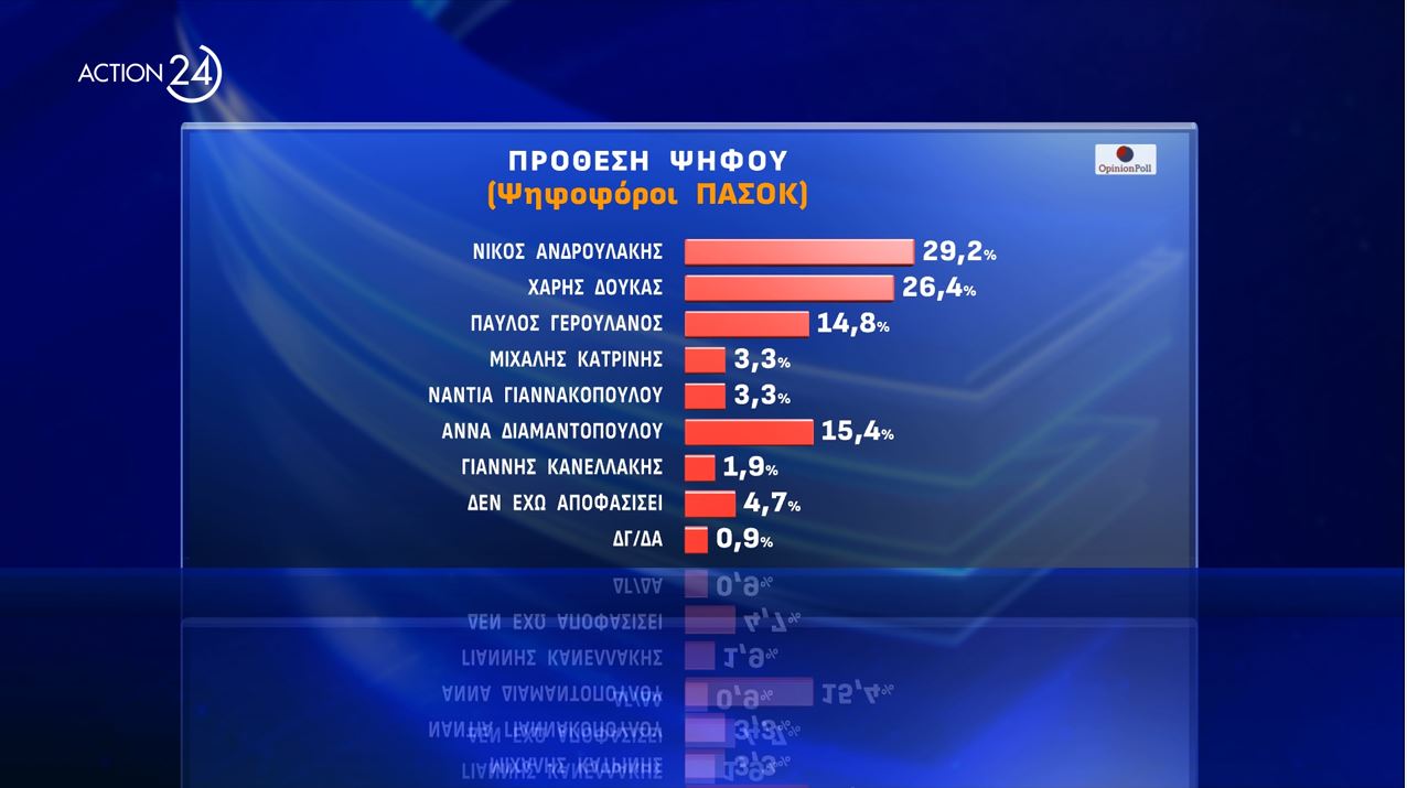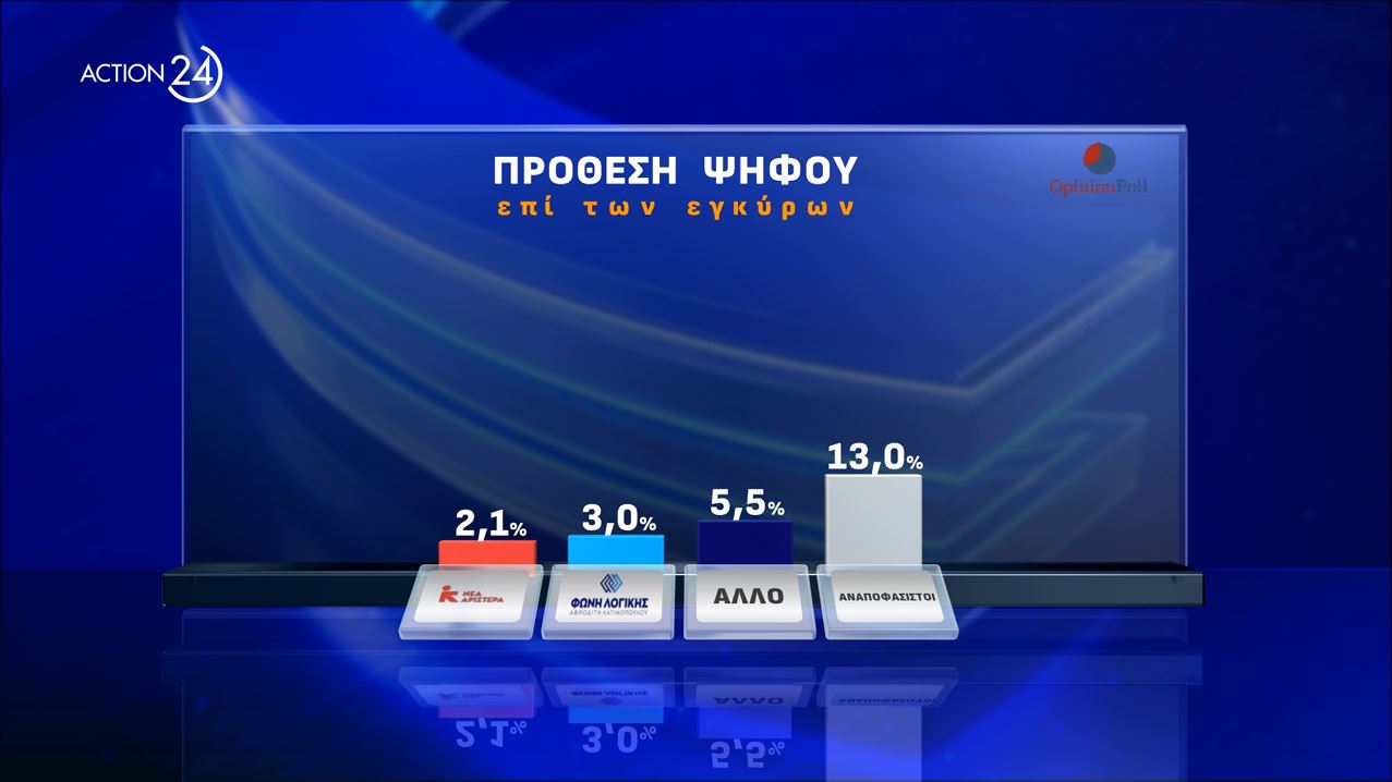 Σύμφωνα με τα στοιχεία της δημοσκόπησης Opinion Poll για λογαριασμό του Action 24 το ΠΑΣΟΚ φαίνεται πως καθιερώνεται ως δεύτερο κόμμα, με την ΝΔ να διατηρεί τα ποσοστά που είχε λάβει στις πρόσφατες ευρωεκλογές.