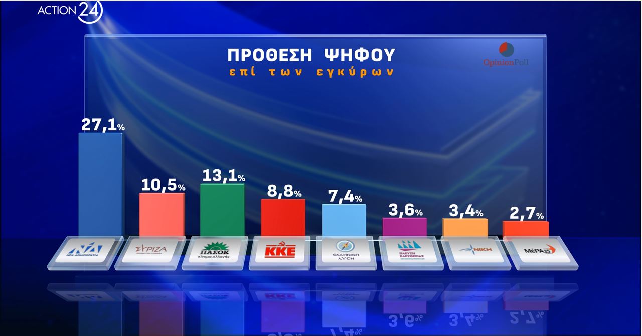 Σύμφωνα με αυτή, η ΝΔ προηγείται με 27,1% έναντι 13,1% του ΠΑΣΟΚ με τον ΣΥΡΙΖΑ (10,5%) και το ΚΚΕ (8,8%) να ακολουθούν.