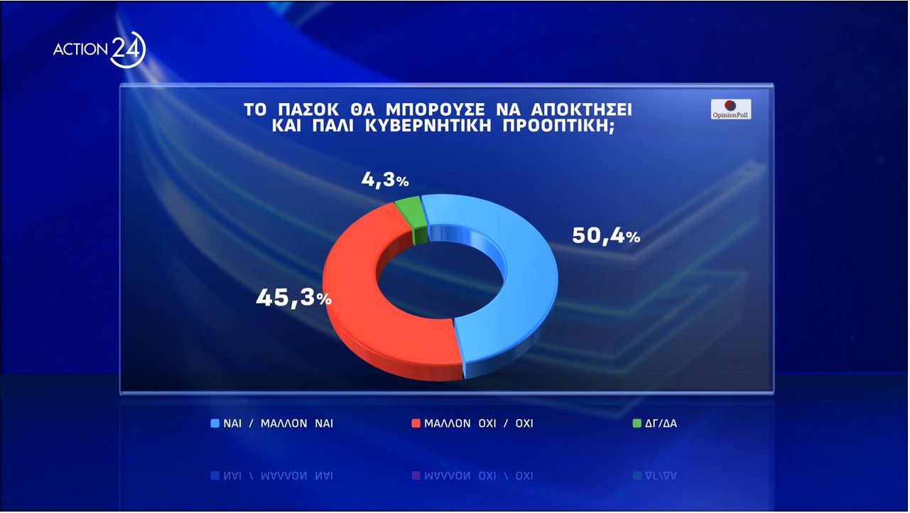 Σε ερώτηση για το εάν το ΠΑΣΟΚ θα μπορούσε να αποκτήσει και πάλι κυβερνητική προοπτική οι πολίτες επίσης με οριακή πλειοψηφία απαντούν θετικά σε ποσοστό 50,4%.