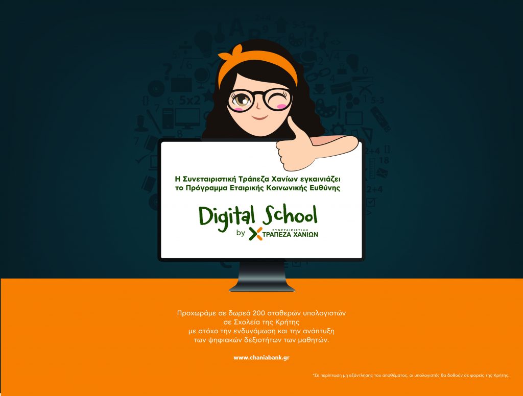 Σε αυτή την κατεύθυνση, υλοποιεί το πρόγραμμα «Digital School by Τράπεζα Χανίων». Το πρόγραμμα αφορά τη δωρεά ψηφιακού εξοπλισμού για τον ευρύτερο εκσυγχρονισμό των ελληνικών σχολείων μέσω της προώθησης νέων και καινοτόμων μεθόδων εκμάθησης που θα συμβάλλουν στη διαδραστική συμμετοχή των μαθητών στη διδασκαλία, ενδυναμώνοντας ταυτόχρονα την ανάπτυξη των ψηφιακών δεξιοτήτων τους.