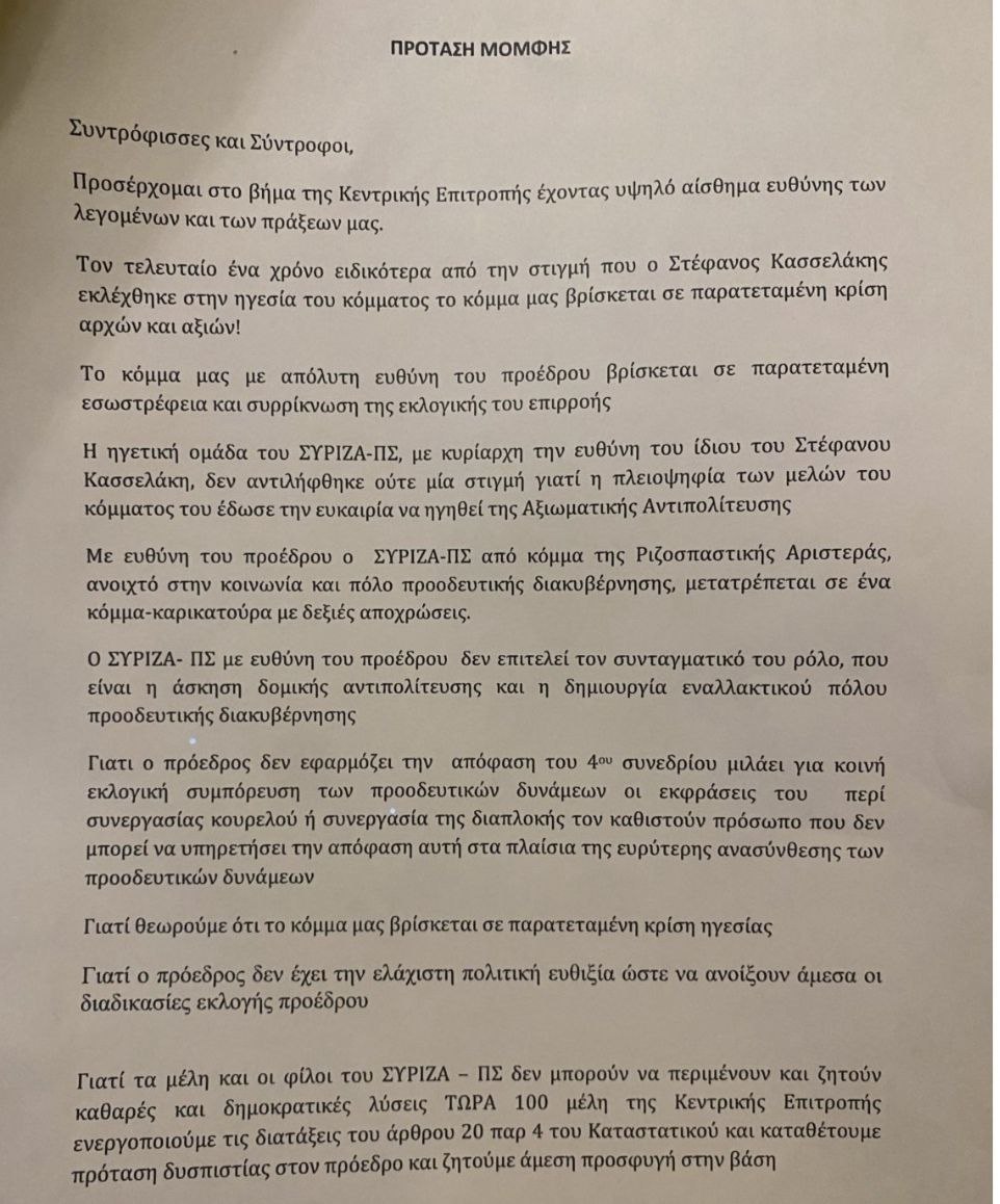 Η ομάδα των «87» κατέθεσε πρόταση μομφής κατά του Στέφανου Κασσελάκη με 100 υπογραφές, όπως άλλωστε είχαν προαναγγείλει στο πρωινό κείμενο που ήρθε στο φως της δημοσιότητας.