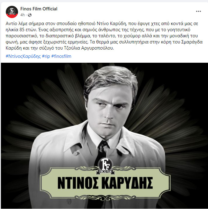 Η Φίνος Φιλμ αποχαιρετά με μια συγκινητική ανάρτηση τον Ντίνο Καρύδη, που έφυγε από τη ζωή την Κυριακή 15 Σεπτεμβρίου 2024 σε ηλικία 85 χρόνων εκφράζοντας τα συλλυπητήριά της στον μεγάλο θεατράνθρωπο απευθυνόμενος στην κόρη του Σμαράγδα Καρύδη και τη σύζυγό του Τζούλια Αργυροπούλου.