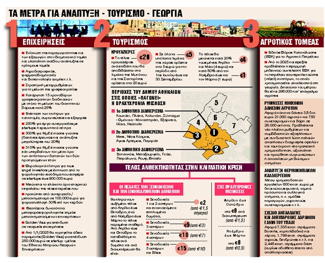 Από την πλευρά της η υπουργός Τουρισμού Ολγα Κεφαλογιάννη ανακοίνωσε την επιβολή κλιμακωτού τέλους για τους επιβάτες κρουαζιέρας, το οποίο θα διαμορφώνεται ανάλογα με το νησί και την τουριστική περίοδο, όπως και την αύξηση του τέλους ανθεκτικότητας που θα ισχύει πλέον για όλα τα τουριστικά καταλύματα. Επίσης, όσον αφορά τις βραχυχρόνιες μισθώσεις, ανέφερε ότι από την 1η Ιανουαρίου 2025 δεν θα επιτρέπονται νέες εγγραφές στα αντίστοιχα μητρώα ακινήτων των 1ου, του 2ου και του 3ου διαμερισμάτων στο κέντρο της Αθήνας, για τουλάχιστον έναν χρόνο, με προοπτική παράτασης του μέτρου, εφόσον αυτό κριθεί απαραίτητο.