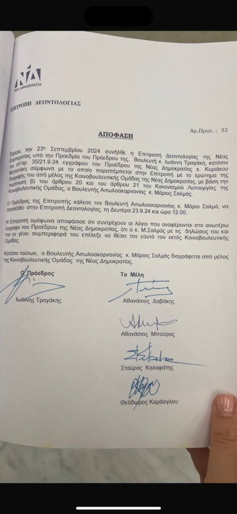 Η απόφαση αναφέρει: «Σήμερα, την 23η Σεπτεμβρίου 2024 συνήλθε η Επιτροπή Δεοντολογίας της Νέας Δημοκρατίας υπό την Προεδρία του Προέδρου της, Βουλευτή κ. Ιωάννη Τραγάκη, κατόπιν του υπ΄αρ. 35/21.9.24 εγγράφου του Προέδρου της Νέας Δημοκρατίας, με βάση την περίπτωση β) του άρθρου 20 και του άρθρου 21 του Κανονισμού Λειτουργίας της Κοινοβουλευτικής Ομάδας, ο Βουλευτής Αιτωλοακαρνανίας, κ. Μάριος Σαλμάς.