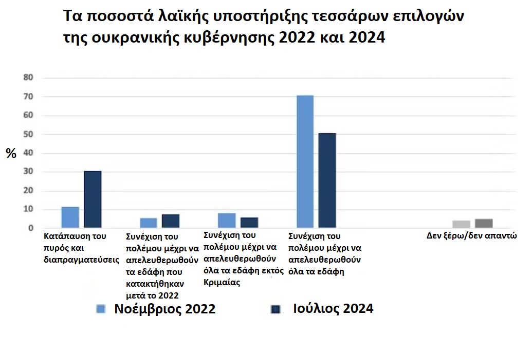 Όπως φαίνεται και στο διάγραμμα, η μεγαλύτερη αλλαγή ήταν ότι το 2022, το 71% των ερωτηθέντων υποστήριξε την πρόταση «να συνεχιστεί ο πόλεμος στη ρωσική επιθετικότητα έως ότου απελευθερωθεί όλη η ουκρανική επικράτεια, συμπεριλαμβανομένης της Κριμαίας», αλλά το 2024 η υποστήριξη για αυτήν την επιλογή είχε πέσει στο 51%.