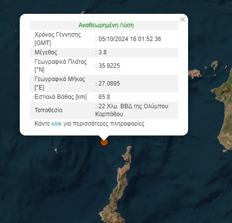 Σεισμός 3,8 Ρίχτερ σημειώθηκε το απόγευμα του Σαββάτου, ανοιχτά της Καρπάθου.