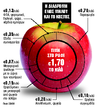 Τα στοιχεία του ΣΕΚΛΑ δείχνουν ότι ένα κιλό μήλα ξεκινά με τιμή παραγωγού στα 0,70 λεπτά στο χωράφι. Σε αυτή την τιμή προστίθεται ανά κιλό: το εργατικό κόστος συγκομιδής (0,10 ευρώ), η αποθήκευση και τα ψυκτικά (0,20 ευρώ), το εργατικό κόστος για τη μεταφορά από το ψυγείο στο τελάρο (0,15 ευρώ), 0,07 ευρώ για τα μεταφορικά (που καθορίζονται ανάλογα με τις τιμές καυσίμων), 0,35 ευρώ τα έξοδα συσκευασίας και 0,13 ευρώ για ΦΠΑ, φορτωτικά, διαλογή, φύρα και το κέρδος εμπόρων. Ετσι ένα κιλό μήλα φτάνει να κοστίζει 1,70 ευρώ.