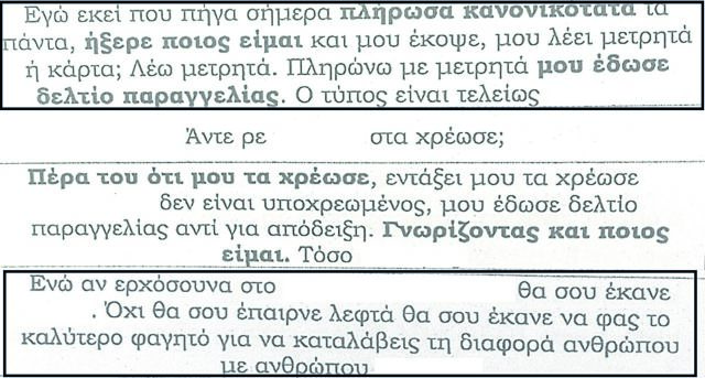 Ωστόσο αυτό δεν συνέβη και την επόμενη ημέρα ο εν λόγω εφοριακός τηλεφώνησε στον λογιστή λέγοντας: «Εγώ εκεί σήμερα πλήρωσα κανονικότατα τα πάντα. Ηξερε ποιος είμαι και μου έκοψε. Μου λέει μετρητά ή κάρτα; Λέω μετρητά. Πληρώνω μετρητά, μου έδωσε δελτίο παραγγελίας. Ο τύπος είναι εντελώς π…ας». Με τον λογιστή να απορεί «Αντε ρε μ… στα χρέωσε;». Με τον εφοριακό να επανέρχεται «πέρα από το ότι μου τα χρέωσε, εντάξει μου τα χρέωσε, εντάξει δεν γ…αι, δεν είναι υποχρεωμένος (σ.σ. πάλι καλά που δεν τίθεται θέμα υποχρέωσης οι εφοριακοί να μην πληρώνουν στα εστιατόρια), μου έδωσε δελτίο παραγγελίας αντί για απόδειξη. Γνωρίζοντας ποιος είμαι. Ο άνθρωπος είναι τρόμπας τελείως…».