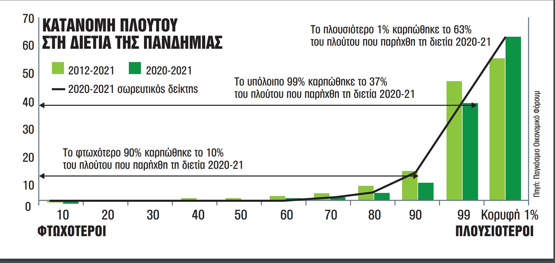 Οι ειδικοί συμφωνούν ότι η περίοδος του COVID-19 και οι πολιτικές που εφαρμόστηκαν κατά τη διάρκειά της επιδείνωσαν τις κοινωνικές ανισότητες στο μεγαλύτερο μέρος του κόσμου. Είναι ενδεικτικό ότι από τις αρχές του 2020 μέχρι το τέλος του 2021 οι περιουσίες των δέκα πλουσιότερων ανθρώπων στον πλανήτη σχεδόν διπλασιάστηκαν, ενώ την ίδια στιγμή το 99% του πληθυσμού «στριμώχτηκε» οικονομικά. Με βάση τους υπολογισμούς του Παγκόσμιου Οικονομικού Φόρουμ, τα δύο τρίτα του πλούτου που «παράχθηκε» μετά την εκδήλωση της πανδημίας βρέθηκε στα χέρια του 1% όσων βρίσκονται στην κορυφή της πυραμίδας.