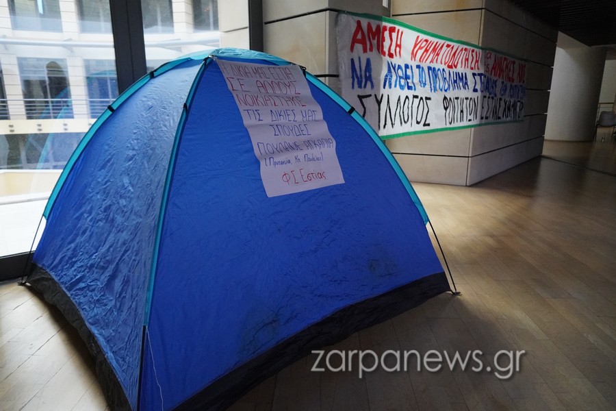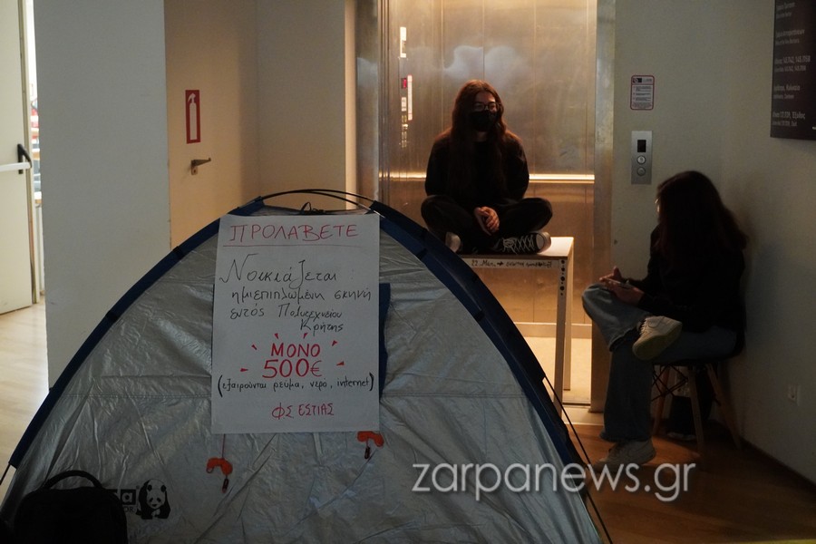 «Νοικιάζεται ημιεπιπλωμένη σκηνή» αναφέρει μία από τις σκηνές στο Πολυτεχνείο Κρήτης.