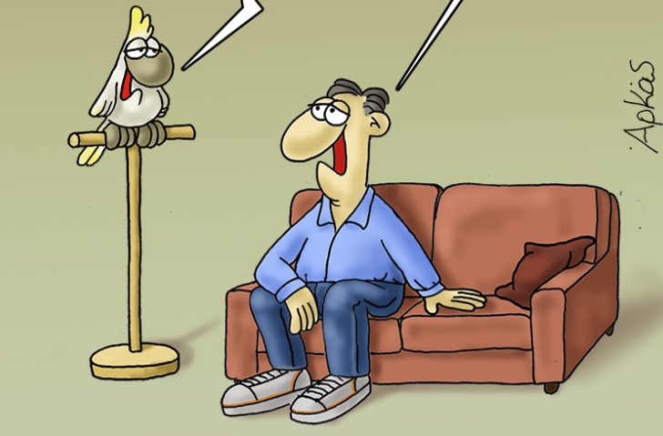 Ο Αρκάς στο σημερινό σκίτσο μας δείχνει έναν παπαγάλο να μιλάει με έναν κύριο κατά τις πρώτες ώρες της ημέρας. Οι δύο τους σχολιάζουν τη χθεσινή βραδιά.