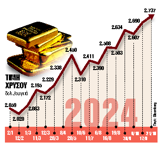 Σε νέα επίπεδα ρεκόρ σκαρφάλωσαν ξανά χθες οι τιμές του χρυσού. Αιτία είναι οι γεωπολιτικές εντάσεις, οι συνεχιζόμενες αγορές από κεντρικές τράπεζες, οι επερχόμενες αμερικανικές εκλογές και οι μειώσεις επιτοκίων από μεγάλες κεντρικές τράπεζες, ειδικά την Ομοσπονδιακή Τράπεζα των ΗΠΑ και την Ευρωπαϊκή Κεντρική Τράπεζα. Η τιμή του πολύτιμου μετάλλου διαμορφώθηκε στα 2.737 δολάρια η ουγκιά, καταγράφοντας συνολική άνοδο 40% φέτος.