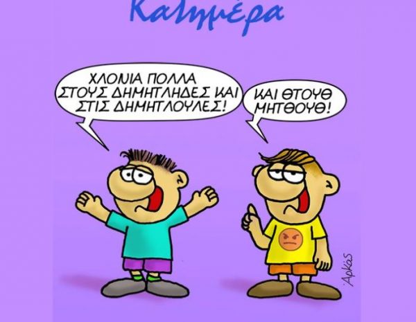 Συγκεκριμένα, στο σημερινό σκίτσο βλέπουμε δύο αγόρια τα οποία βρίσκονται στο κλίμα της ημέρας. Το ένα εκ των δύο λέει: «Χλόνια Πολλά στους Δημήτληδες και στις Δημητλούλες» και το άλλο αγόρι σχολιάζει «Και Θτουθ Μητθοθ».