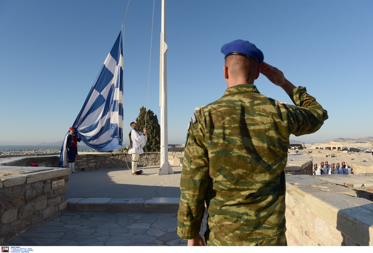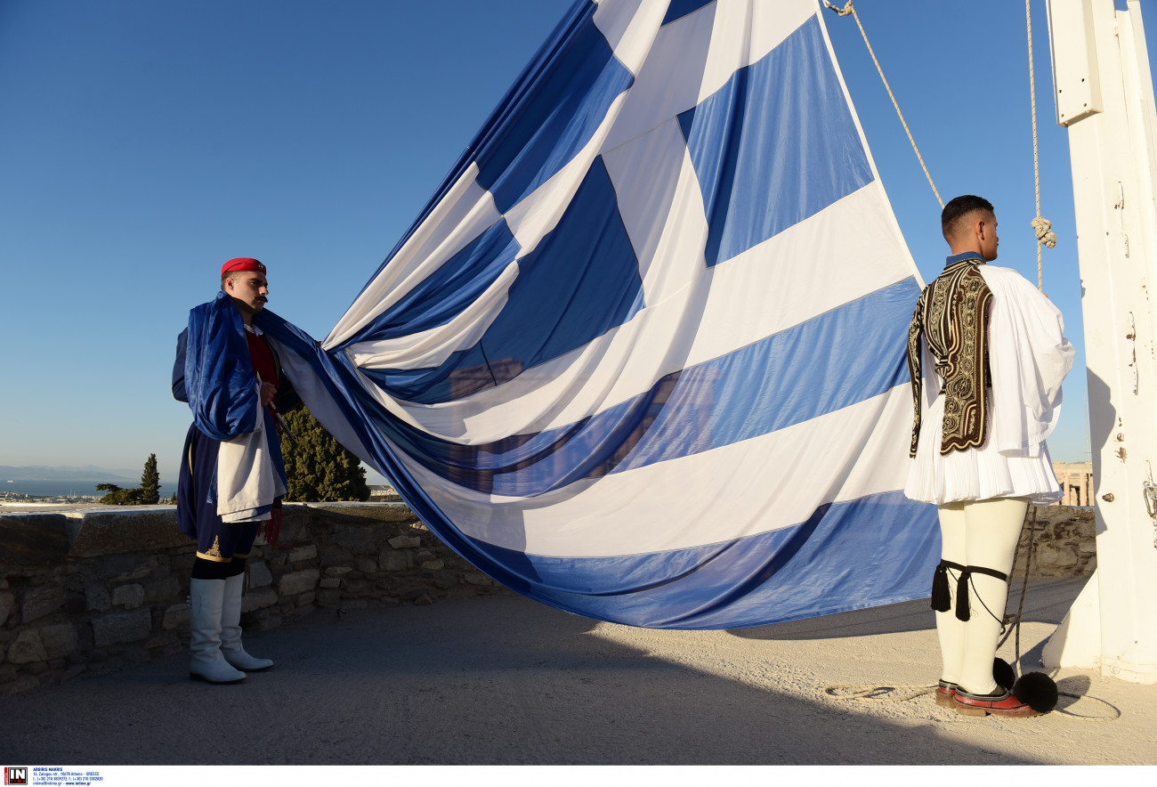 Όσοι βρέθηκαν το πρωί της Δευτέρας στον Ιερό Βράχο παρακολούθησαν τους Εύζωνες της Προεδρικής Φρουράς να υψώνουν στον ιστό την ελληνική σημαία.