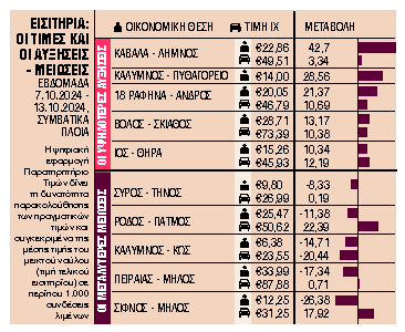 Την 41η εβδομάδα του Οκτωβρίου η γραμμή Καβάλα – Λήμνος είναι πρωταθλήτρια στην αύξηση της τιμής (42,70%) ενώ στα ταχύπλοα η γραμμή Σίφνος – Μήλος καταγράφει τη μεγαλύτερη αύξηση (29,58%). Στις μειώσεις η υψηλότερη σημειώνεται στη γραμμή Σύρος – Μύκονος (47,04%).