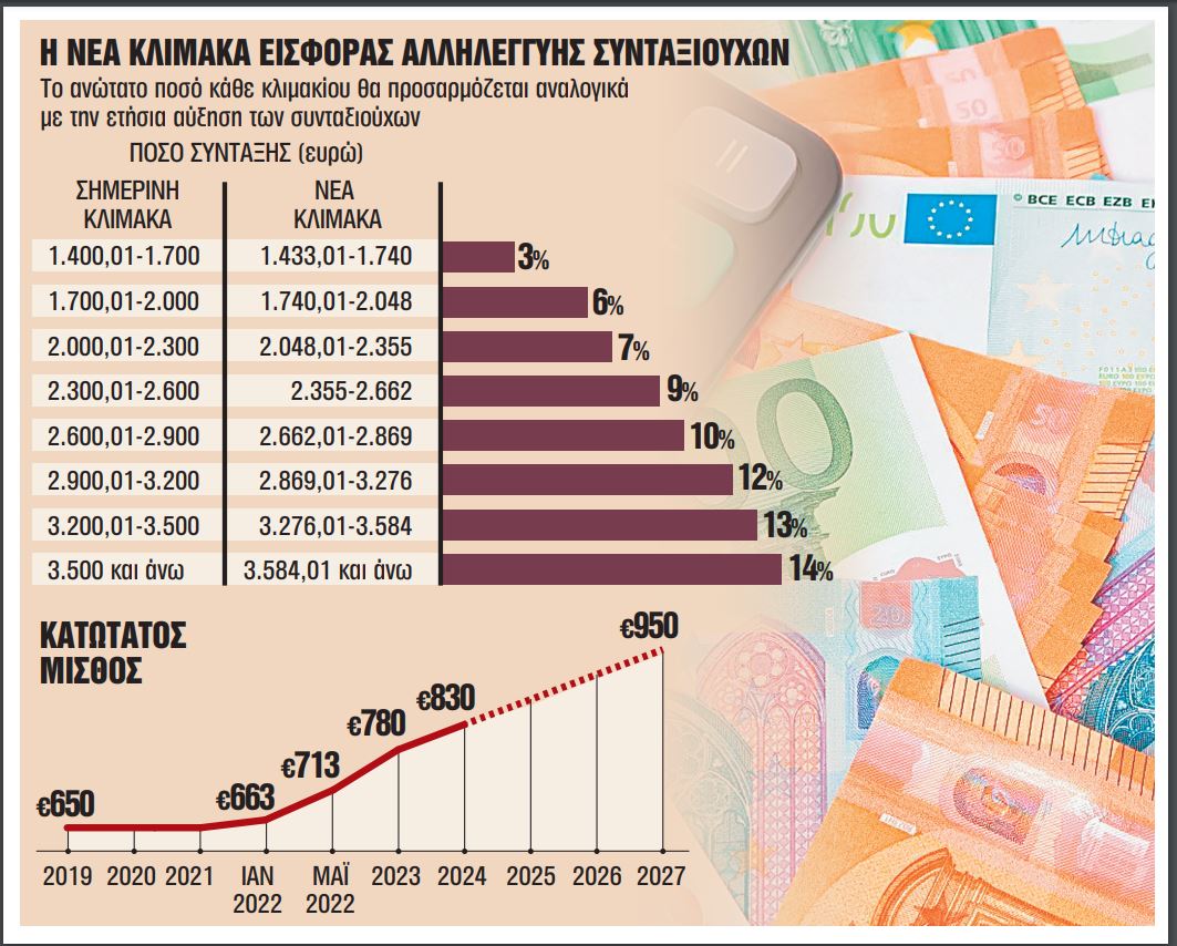 Για παράδειγμα, εάν η αύξηση των συντάξεων είναι 2,4%, τότε από 1ης Ιανουαρίου 2025, η εισφορά 3% για το πρώτο κλιμάκιο που εφαρμόζεται για συντάξεις άνω των 1.400 ευρώ, θα εφαρμόζεται για συντάξιμες αποδοχές άνω των 1.433 ευρώ.