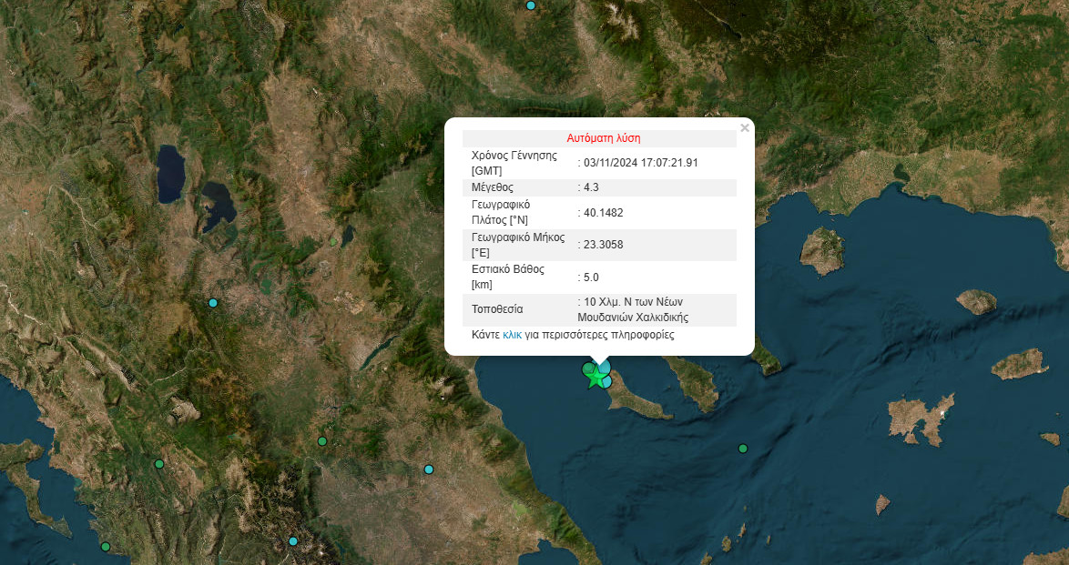 Το επίκεντρο του σεισμού, σύμφωνα με το Γεωδυναμικό Ινστιτούτο Αθηνών, εντοπίζεται 11 χιλιόμετρα νότια των Νέων Μουδανιών Χαλκιδικής.
