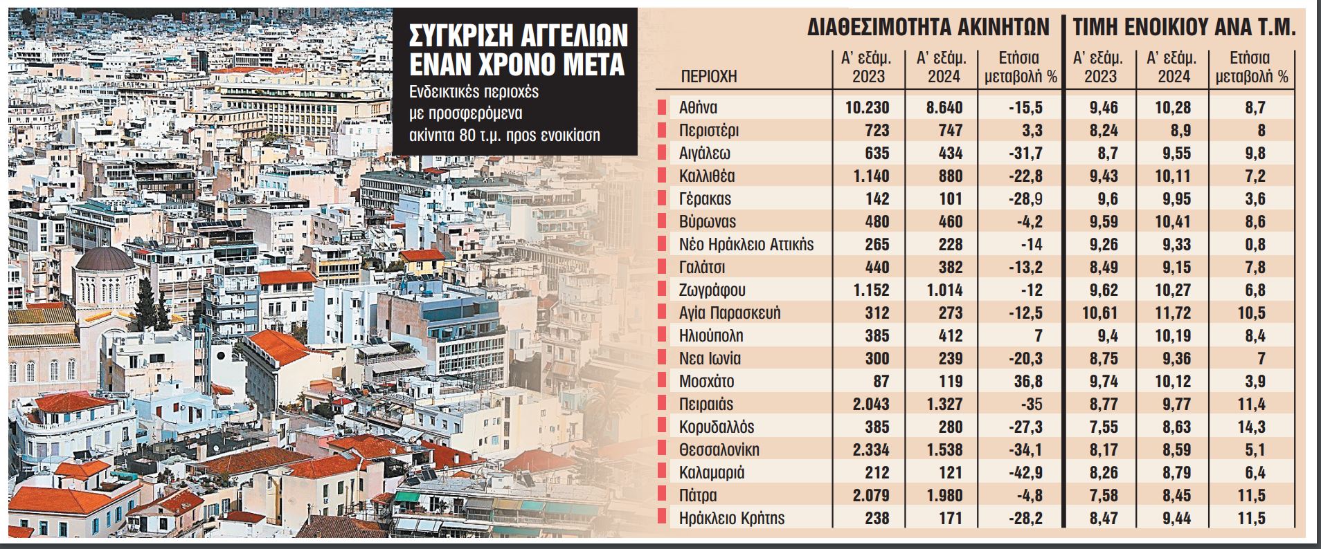 Σύμφωνα με στοιχεία και μελέτες της αγοράς ενοικίασης κατοικιών στην Ελλάδα, η μείωση της προσφοράς, κυρίως στις μεγάλες πόλεις όπως η Αθήνα και η Θεσσαλονίκη, εκτινάσσει τις τιμές, με τους ενοικιαστές να επιδίδονται σε «κυνήγι θησαυρού» για να βρουν στέγη.