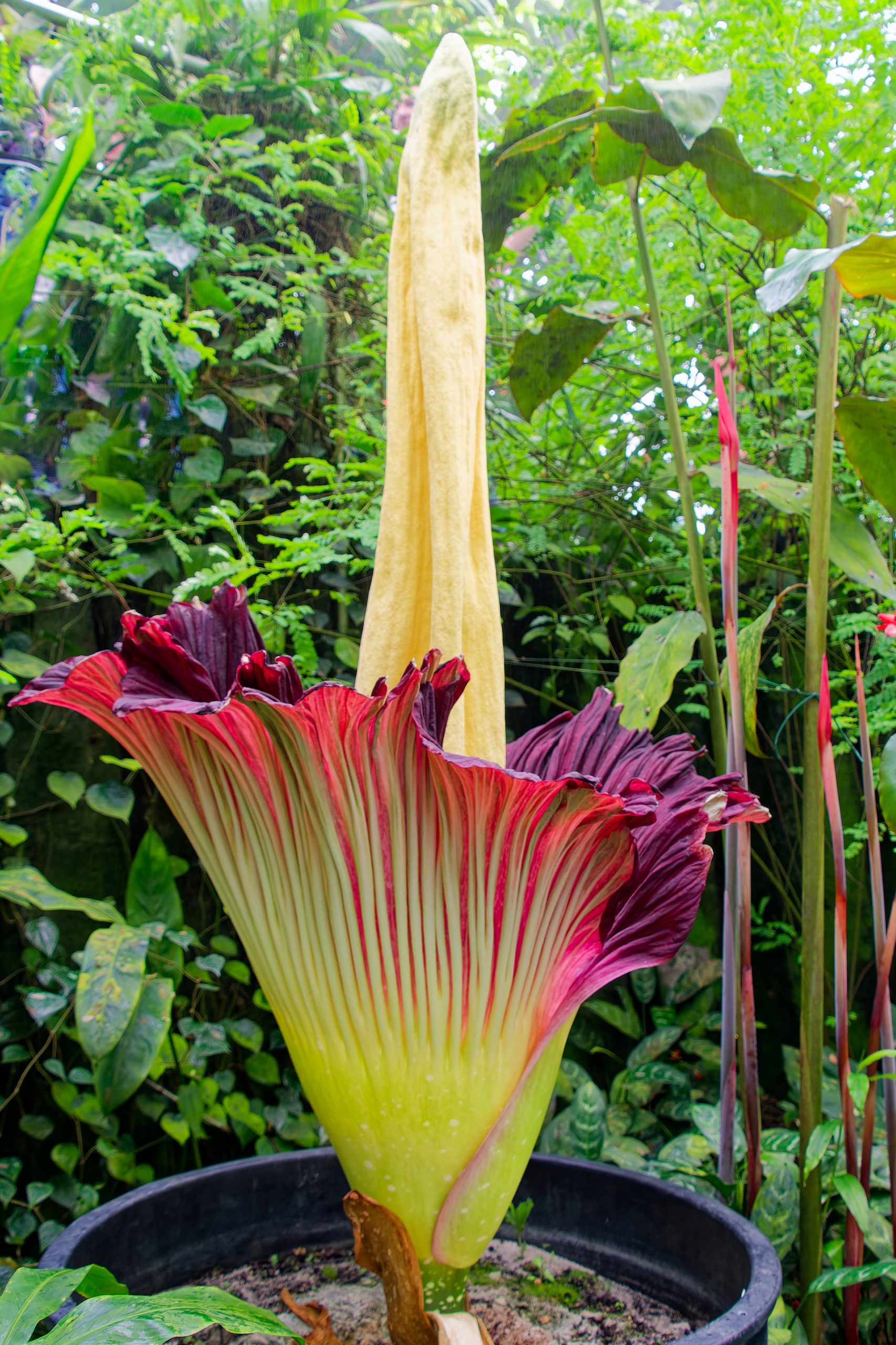 Πρόκειται για το λεγόμενο «λουλούδι – πτώμα», ή Amorphophallus Titanum (συχνά συντομεύεται σε Titan Arum), το οποίο πήρε το όνομά του από τη δυσοσμία που απελευθερώνει όταν ανθίζει για να προσελκύσει επικονιαστές όπως σκαθάρια και μύγες.