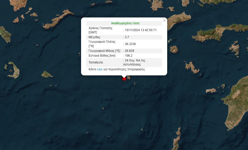 Σεισμός μεγέθους 3,7 βαθμών της Κλίμακας Ρίχτερ σημειώθηκε 34 χιλιόμετρα νοτιοανατολικά της Αστυπάλαιας στις 15:42 το μεσημέρι της Παρασκευής (15/11).