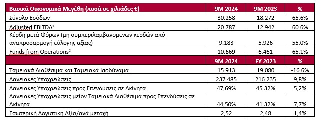 - Τα Καθαρά Κέρδη, μη συμπεριλαμβανομένων των κερδών από την αναπροσαρμογή της εύλογης αξίας των επενδύσεων σε ακίνητα ανήλθαν σε 9,2 εκατ. ευρώ έναντι 5,9 εκατ. ευρώ (αυξημένα κατά 55,0%) σε σύγκριση με το Εννεάμηνο 2023.