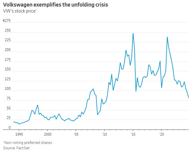 Η VW δεν είναι μόνη. Την Κυριακή, η δεύτερη μεγαλύτερη αυτοκινητοβιομηχανία της Ευρώπης Stellantis δήλωσε ότι ο σκληροτράχηλος διευθύνων σύμβουλός της Carlos Tavares θα παραιτηθεί , εν μέσω αυξανόμενων εντάσεων με προμηθευτές και πολιτικούς. Τον περασμένο μήνα, η ευρωπαϊκή επιχείρηση της Ford ανακοίνωσε 4.000 περικοπές θέσεων εργασίας. Μεγάλοι προμηθευτές της βιομηχανίας όπως η Bosch και η ZF Friedrichshafen απολύουν επίσης χιλιάδες εργαζομένους ο καθένας.