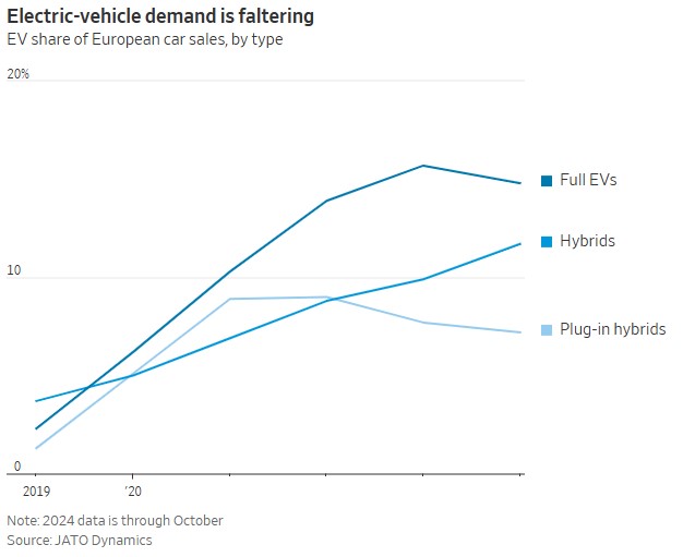 Οι ευρωπαϊκές αυτοκινητοβιομηχανίες σχεδίαζαν μια ταχεία υιοθέτηση ηλεκτρικών οχημάτων, υποκινούμενη από τις ρυθμιστικές αρχές. Αλλά μετά από μια πρώιμη έκρηξη ενθουσιασμού, οι καταναλωτές δεν συνεργάστηκαν, επιφυλακτικοί για τις υψηλές τιμές και την ανομοιογενή υποδομή φόρτισης. Οι επιδοτήσεις αποσύρθηκαν τον περασμένο Δεκέμβριο στη Γερμανία, πλήττοντας σκληρά τη μεγαλύτερη αγορά ηλεκτρικών οχημάτων της Ευρώπης.