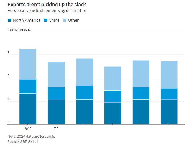 Οι εξαγωγές, μια παραδοσιακή δύναμη των ευρωπαϊκών κατασκευαστών αυτοκινήτων πολυτελείας, δεν αντισταθμίζουν μια μικρότερη, πιο πολυσύχναστη εγχώρια αγορά. Η S&P Global αναμένει ότι οι αποστολές οχημάτων από την Ευρώπη θα ανέλθουν συνολικά σε 2,7 εκατομμύρια φέτος, 16% χαμηλότερες από το 2019.