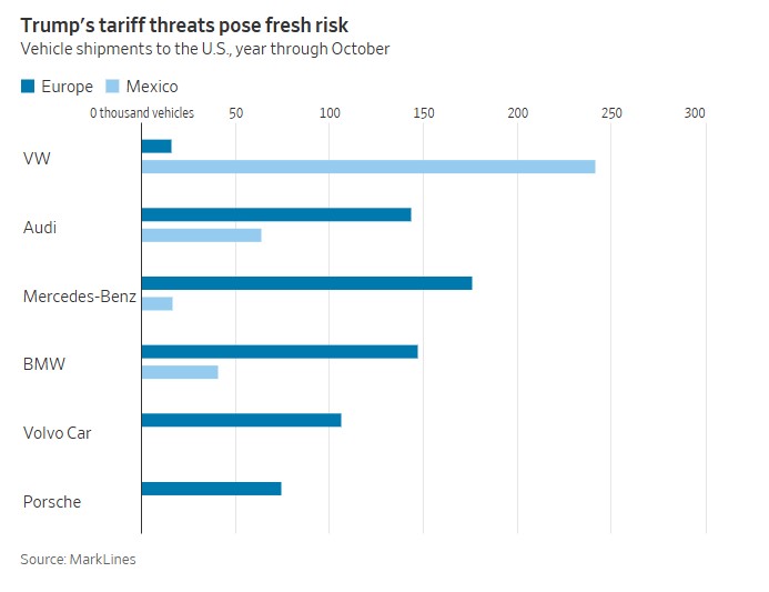 Ο Τραμπ, επίσης, έχει πει ότι θα επιβάλει δασμούς. Δεν πρόκειται μόνο για αποστολές από την Ευρώπη: η VW, η Audi, η Mercedes-Benz και η BMW κατασκευάζουν επίσης προϊόντα στο Μεξικό για τις ΗΠΑ Την περασμένη εβδομάδα, ο Τραμπ είπε ότι θα επιβάλει δασμούς 25% σε προϊόντα που εισάγονται από το νότιο γείτονά της.