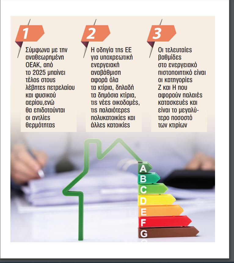 Στην κλίμακα (για τα Ελληνικά Δεδομένα) ενεργειακής απόδοσης από το Α έως το Η, τα κτίρια κατοικιών θα πρέπει να επιτύχουν την κατάταξή τους τουλάχιστον στην κατηγορία Ε έως το 2030 και στη Δ έως το 2033. Τα μη οικιστικά και τα δημόσια κτίρια θα πρέπει να ανήκουν στις σχετικές κατηγορίες έως το 2027 και το 2030 αντίστοιχα.