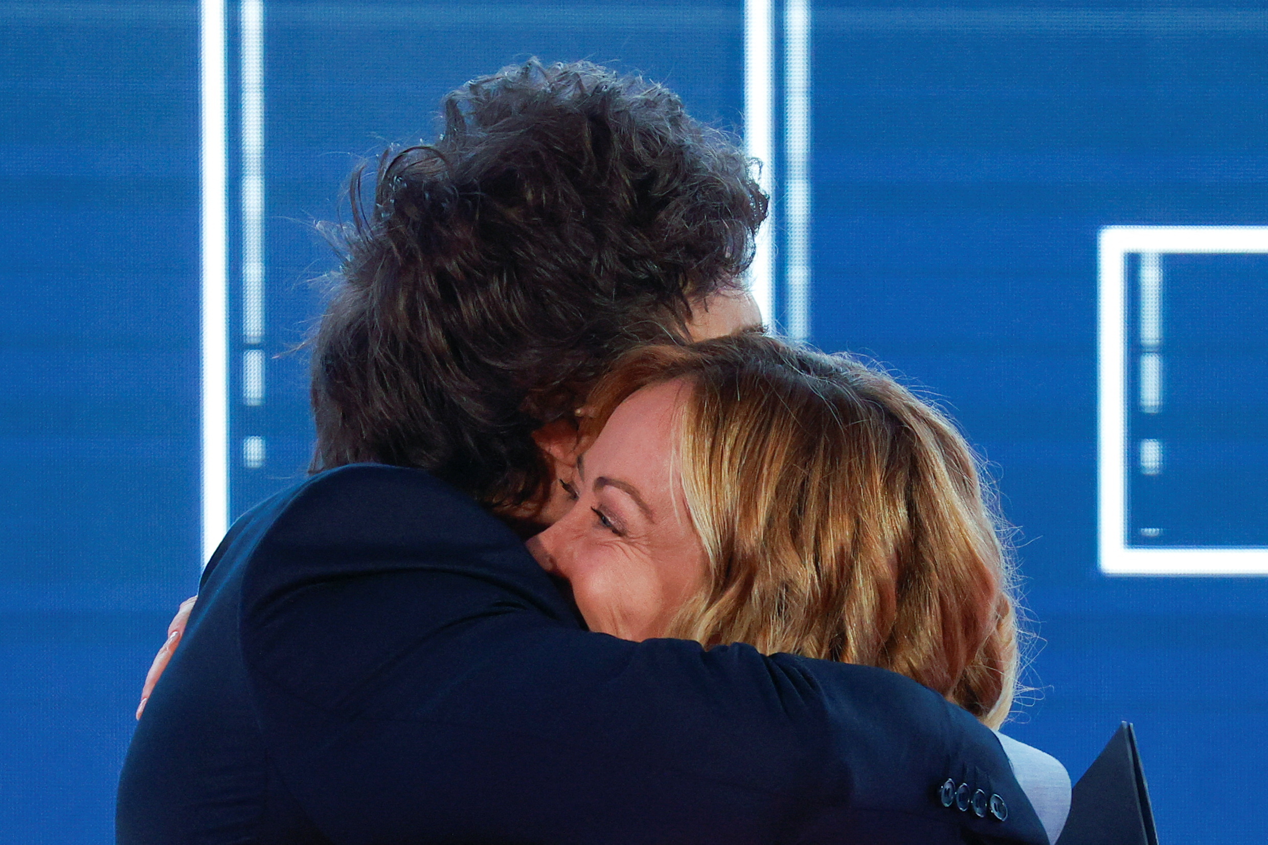 Ο πρόεδρος της Αργεντινής Χαβιέρ Μιλέι και η πρωθυπουργός της Ιταλίας Τζόρτζια Μελόνι αγκαλιάζονται καθώς παρακολουθούν το πολιτικό φεστιβάλ Atreju που διοργανώνεται από το δεξιό κόμμα του Μελόνι Αδέλφια της Ιταλίας (Fratelli d’Italia), στη Ρώμη, Ιταλία, 14 Δεκεμβρίου 2024.