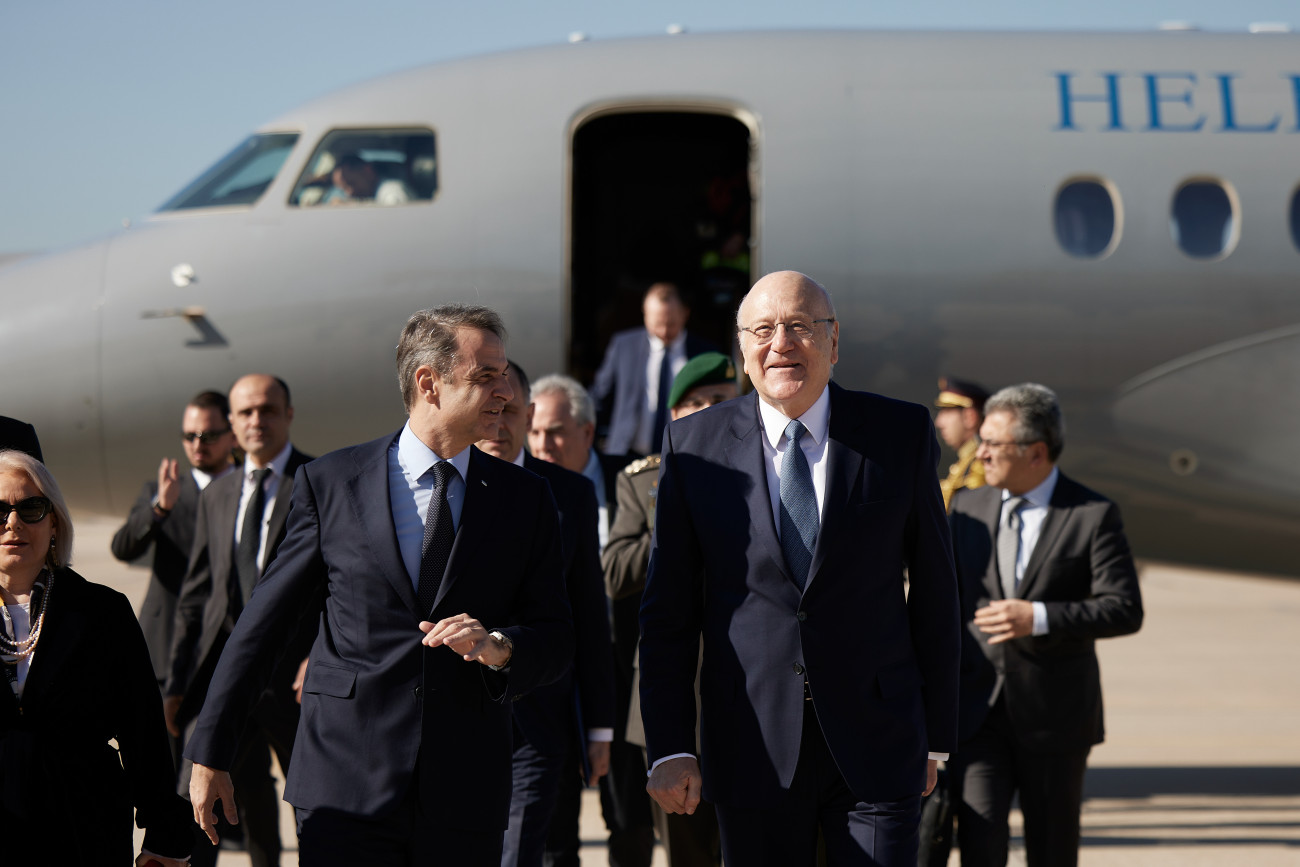 Ο πρωθυπουργός του Λιβάνου Najib Mikati υποδέχθηκε τον Κυριάκο Μητσοτάκη στο αεροδρόμιο της Βηρυτού.