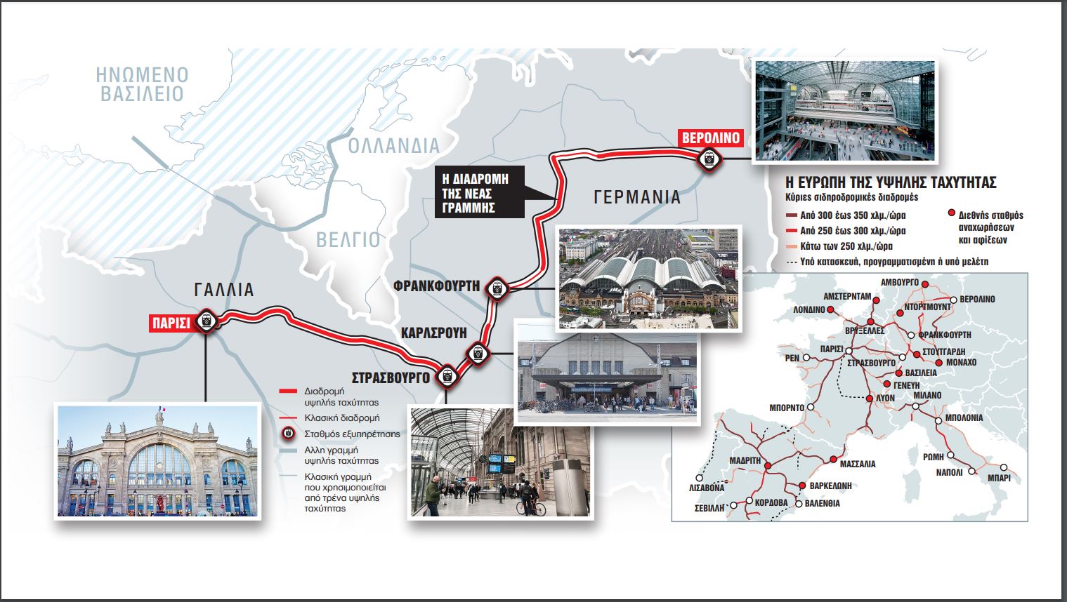 Η σύνδεση εξυπηρετεί επίσης το Στρασβούργο στη Γαλλία και στη Γερμανία τους σταθμούς της Καρλσρούης και της Φρανκφούρτης. Μέχρι χθες δεν υπήρχε αμαξοστοιχία που να συνδέει απευθείας το Παρίσι με το Βερολίνο και η σιδηροδρομική σύνδεση περιελάμβανε τουλάχιστον μία αλλαγή.