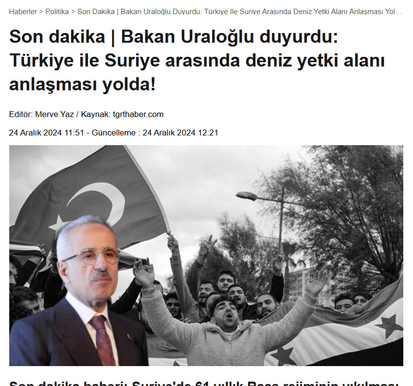 Σύμφωνα με την ιστοσελίδα οι δηλώσεις που προαναγγέλλουν τη σύναψη συμφωνίας θαλασσίων ζωνών Τουρκίας – Συρίας ανήκουν στον Υπουργό Μεταφορών και Υποδομών της Τουρκίας Αμπτουλκαντίρ Ουράλογλου.