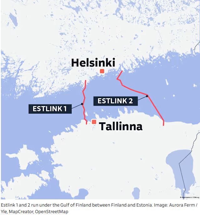 Η Εσθονία ξεκίνησε ναυτική επιχείρηση για την προστασία των υποθαλάσσιων καλωδίων ηλεκτρικής ενέργειας την Παρασκευή, μετά την υποψία δολιοφθοράς ενός άλλου καλωδίου στη Βαλτική Θάλασσα από πλοίο που ανήκει στον λεγόμενο «σκιώδη στόλο» της Ρωσίας. Τα εν λόγω καλώδια μεταφέρουν ενέργεια κυρίως από την Φινλανδία στην Εσθονία και σπανίως καλύπτουν ενεργειακές ανάγκες της Φινλανδίας.