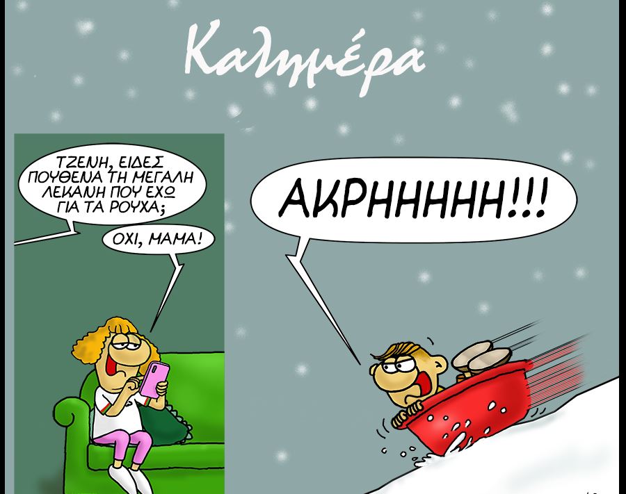 Συγκεκριμένα βλέπουμε την αδερφή του Θανασάκη να κρατάει το κινητό της και να την ρωτάει η μητέρα της «Τζένη, είδες πουθενά τη μεγάλη λεκάνη που έχω για τα ρούχα;» και εκείνη να απαντά «όχι, μαμά», ενώ παράλληλα να βλέπει το Θανασάκη να έχει μετατρέψει τη λεκάνη σε παιχνίδι για να κάνει skateboard στα χιόνια.